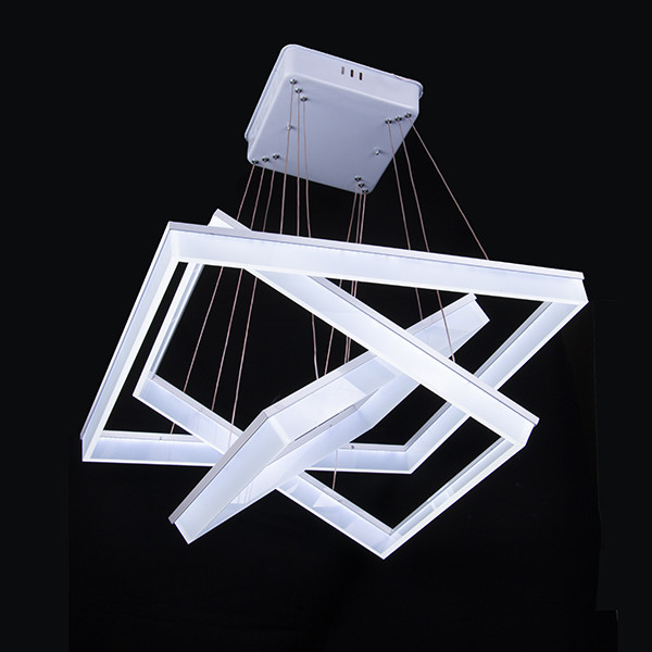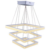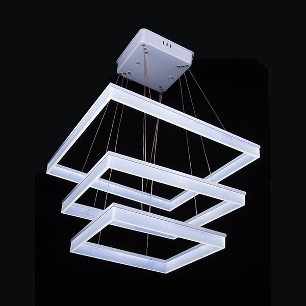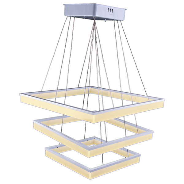 لوستر مدرن سه طبقه مربع شامل سه طبقه مربع از جنس آلومینیوم و پلکسی گلاس میباشد که ارتفاع و چیدمان قابلیت تعویض دارد. دارای ریموت کنترل جهت تنظیمات نور و شدت پخش نور و روشن خاموش کردن. از لحاظ روشنایی فضای 20 متری رو نورپردازی میکند. سایز طبقات به ترتیت 60x60، 50x50، 40x40 سانتی متر میباشد و تمام قطعات قابلیت تعویض دارند.