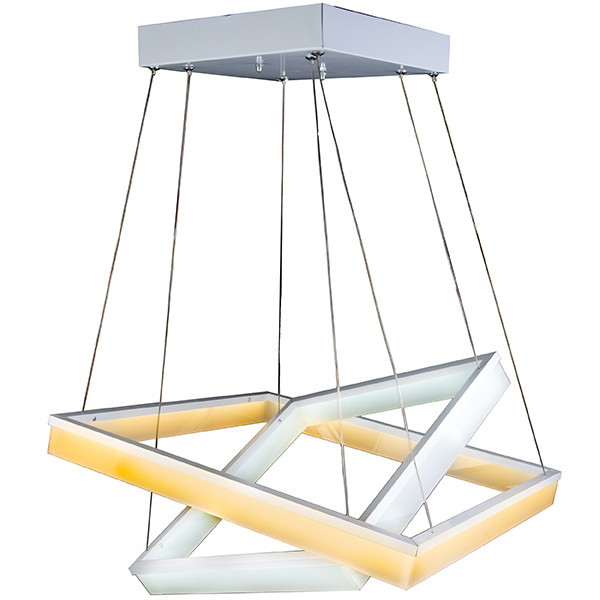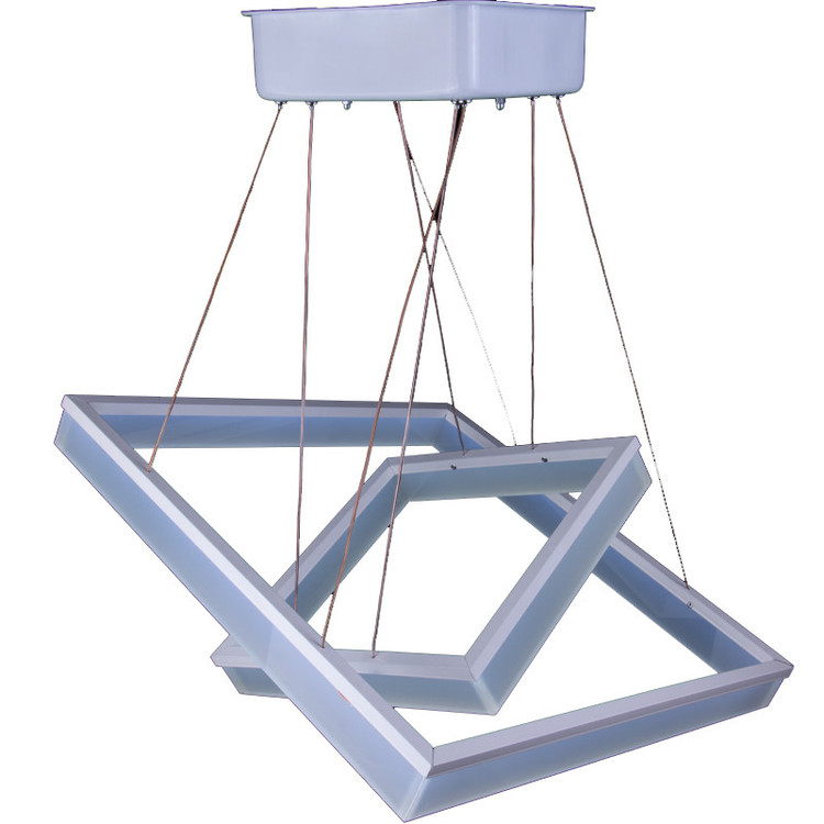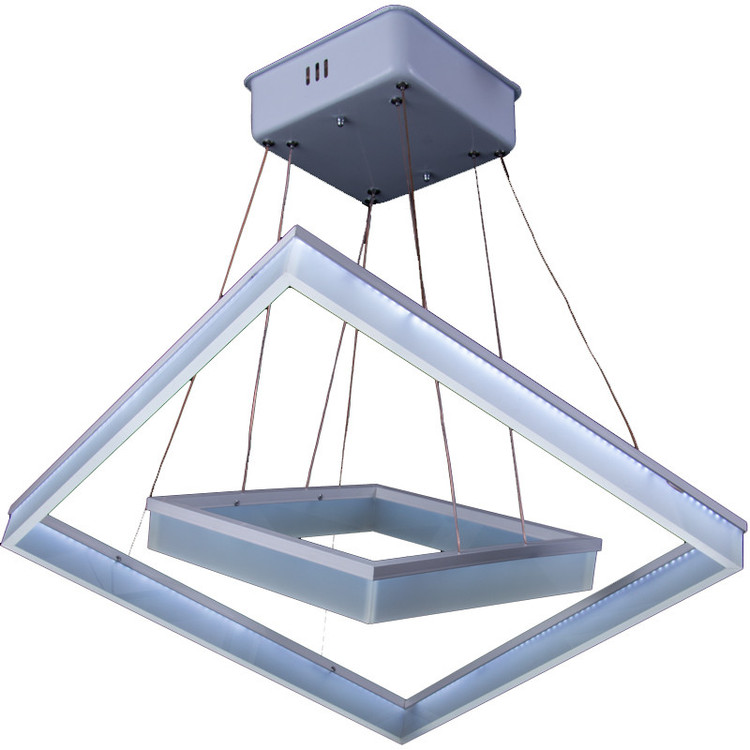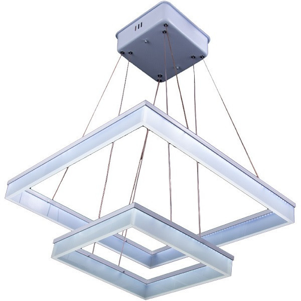 لوستر مدرن دو طبقه مربع شامل دو طبقه مربع از جنس آلومینیوم و پلکسی گلاس میباشد که ارتفاع و چیدمان قابلیت تعویض دارد. دارای ریموت کنترل جهت تنظیمات نور و شدت پخش نور و روشن خاموش کردن. از لحاظ روشنایی فضای 12 متری رو نورپردازی میکند. سایز طبقات به ترتیت 50x50 ، 30x30 سانتی متر میباشد و تمام قطعات قابلیت تعویض دارند.